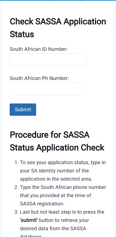 به لطف فرآیند درخواست آنلاین ساده ما، اکنون دریافت کمک هزینه SASSA در دسترس تر است. با استفاده از وبسایت Sassacheckapp ما، میتوانید به راحتی از خانه خود برای کمک هزینه درخواست دهید، که نیازی به بازدید از یک دفتر خدمات را از بین میبرد و در نهایت در زمان و تلاش شما صرفهجویی میکند. اگر درخواست اولیه شما موفقیت آمیز نباشد، ما فرصت درخواست مجدد را ارائه می دهیم و اطمینان حاصل می کنیم که می توانید به کمکی که به درستی سزاوار آن هستید دسترسی پیدا کنید.