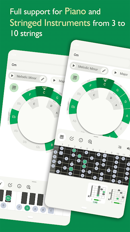 Pocket Composer یک فرهنگ لغت جامع از تمام آکوردها و مقیاس های موجود در موسیقی غربی برای سازهای پیانو و زهی ارائه می دهد. اکنون از هر ساز زهی با فرتبورد پشتیبانی میکند و به شما امکان میدهد هر کوک را روی یک ساز با 3 تا 10 سیم اعمال کنید.