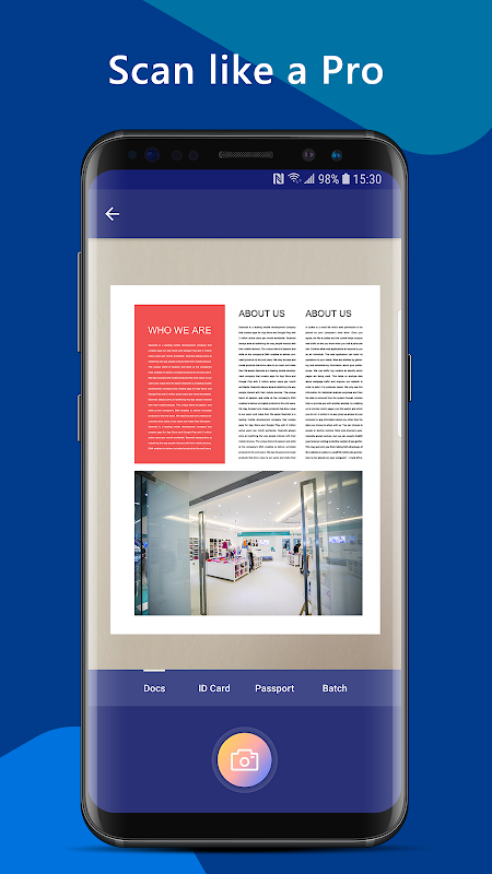با استفاده از این برنامه اسکنر اسناد pdf می توانید اسناد ، عکسها ، رسیدها ، گزارشها یا هر چیزی را اسکن کنید. این برنامه اسکنر سند pdf رعد و برق سریع و زیبا برای هر دو تلفن و تبلت طراحی شده است.