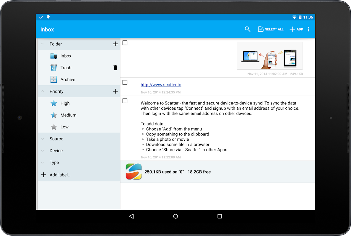 Scatter is a fast and secure data and file syncing service for Android, Windows and iOS. Keep your photos, videos, hyperlinks, text-snippets or any other files in sync across all of your devices and your PC and have Scatter transfer them automatically. The data is stored on your devices only, so your privacy is guaranteed.