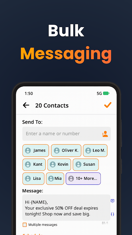 • یک پیام بفرستید، به بسیاری برسید! به طور کارآمد پیامها را به چندین مخاطب برای اهداف پیامک ارسال کنید. هر گیرنده پیام را به صورت جداگانه دریافت می کند، درست مانند یک متن شخصی.