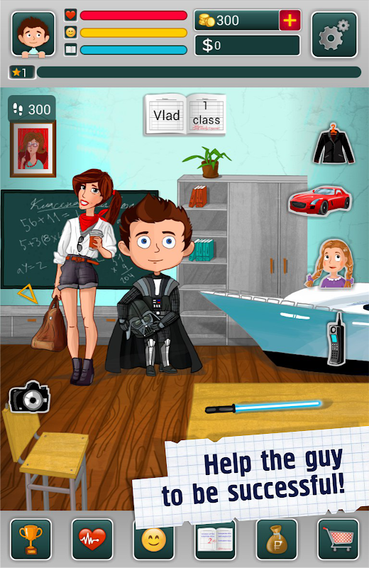The guy starts from scratch and he needs your help! Will he be successful, rich and popular or become a loser? His life is in your hands. You can do different cool business from saling chalk to making your own startup. You can stir up any girl, including Miss of the World. Lots of fantastic gadgets that can help you in the game are available to you. A lot of cool cars and clothing. Download the game, it will be interesting! :)