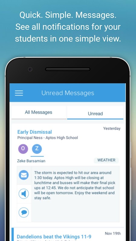 - صندوق ورودی آسان برای خواندن که همه اعلان های SchoolMessenger را ضبط می کند ، و اکنون پیام های معلم-والدین-دانش آموز دو طرفه (در صورت فعال شدن توسط مدرسه یا منطقه)