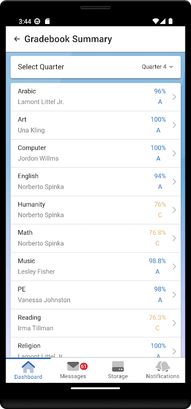 این برنامه تلفن همراه سازمانی به طور خاص به صنعت آموزش و پرورش میپردازد و هدف آن ارتقای مشارکت والدین و دانشآموزان با اطمینان از ارتباط بیوقفه است. این برنامه یک نمای کلی شفاف از نمرات، مشارکت و فعالیت های آینده دانش آموزان ارائه می دهد.