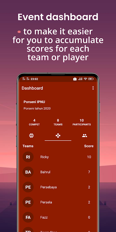 Dashboard will display a list of matches, a list of participants along with the total points earned by each participant and a list of teams along with the total points earned by each team