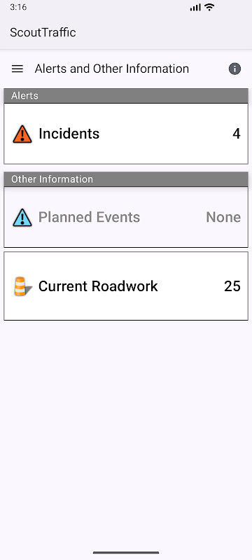 کانزاس سیتی پیشآهنگی برنامه ترافیک فراهم می کند مسافران و مسافران با دسترسی به تلفن همراه به اطلاعات برای کانزاس سیتی مترو جاده منطقه از شهر کانزاس پیشآهنگی از سیستم حمل و نقل حمل و نقل هوشمند (ITS). اطلاعات موجود شامل موارد زیر است: