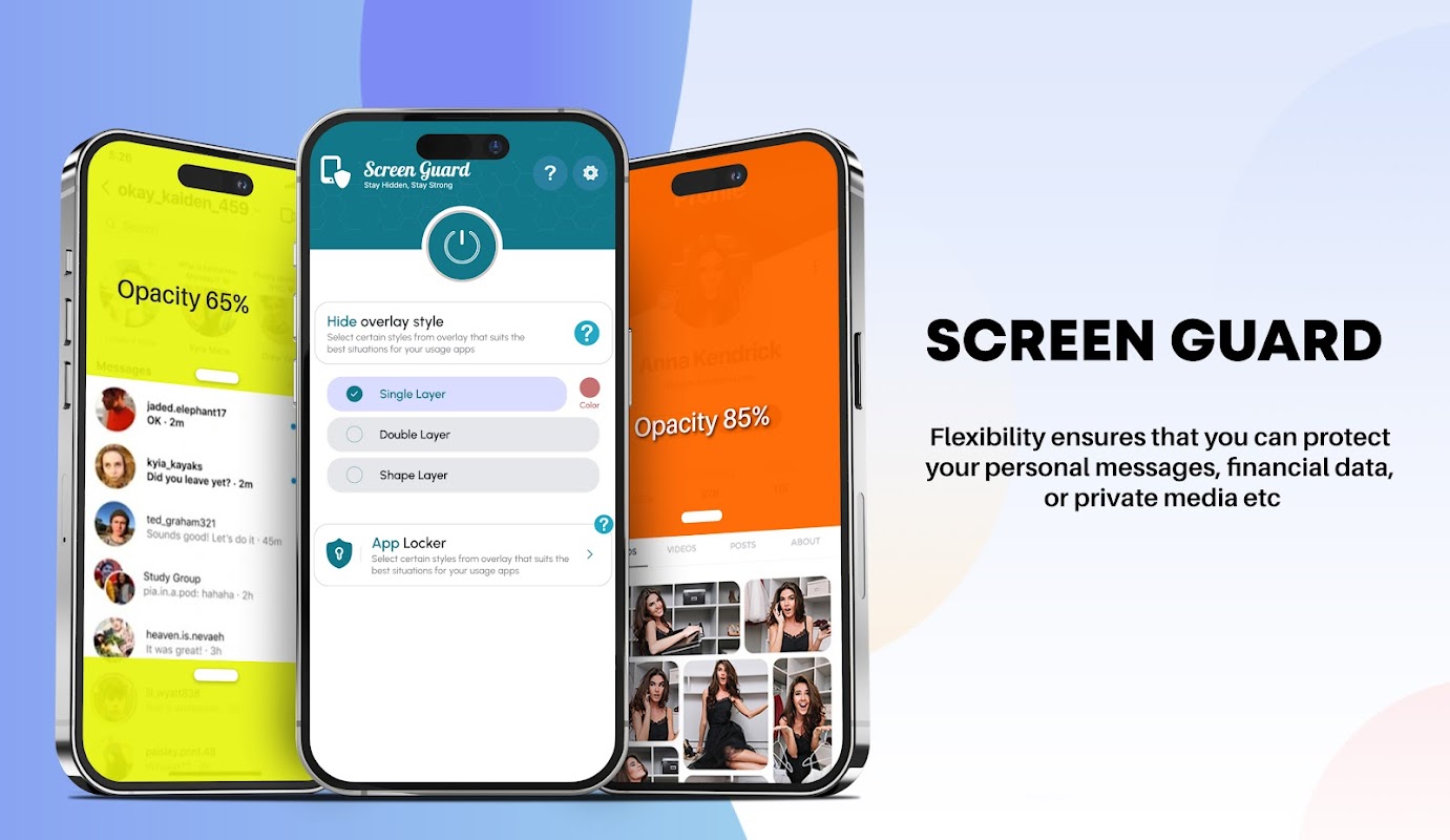 برنامه Screen Shade از خواندن پیامک شما در مقابل دیگران محافظت می کند. این یک برنامه محافظ صفحه نمایش خواندن ماسک تقلب است. بهترین بلوک صفحه نمایش حریم خصوصی محافظ صفحه برای همه برنامه ها. با توجه به صفحه نمایش مخفی قابل تنظیم، کاربران می توانند به راحتی قسمتی یا کل صفحه موبایل خود را با توجه به صفحه حریم خصوصی موبایل خود مخفی کنند. این محافظ صفحه نمایش برای مخفی چت و محافظ صفحه برای گوشی های اندرویدی است. Phone Screen Guard یکی دیگر از برنامه های گفتگوی مخفی است.