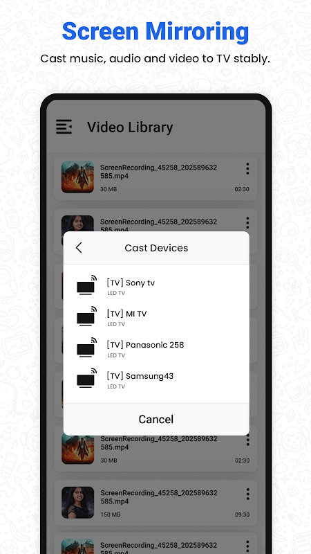برنامه Cast TV به آینهکاری صفحه نمایش اجازه میدهد تا با هر دستگاهی (تلفن هوشمند، تلویزیون هوشمند، لپتاپ، تبلت) در هر مکان، فیلم، موسیقی، عکس و غیره را در تلفن هوشمند شما پخش کند. این برنامه Screen Mirroring به شما امکان میدهد تا دستگاه خود را به راحتی به تلویزیون وصل کنید.