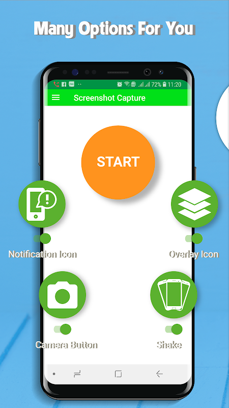 ✓ One touch on floating button, notification, camera button or shaking device to take screenshot