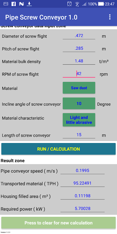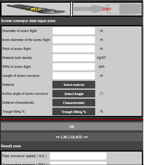 کاربر ورودی قطر پرواز پیچ ، پیچ ، چگالی مواد انتقال یافته ، دور در دقیقه پرواز ، طول و مواد انتخاب شده ، زاویه شیب ، ویژگی های خاص از لیست را وارد می کند.
