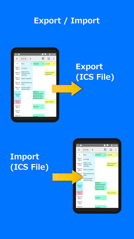 شما همچنین می توانید فایل های ics ایجاد شده در خارج از این برنامه را وارد کنید، اما آنها به طور رسمی پشتیبانی نمی شوند.