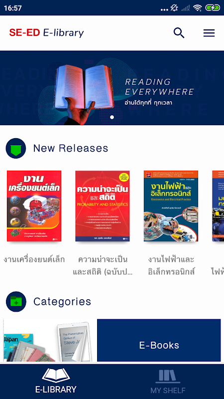 SE-ED E-Library یک بستر الکترونیکی خواننده الکترونیکی است که شرکت SE-ED با ناشران برجسته در تایلند همکاری می کند. به منظور تسهیل دسترسی همه سازمانها به کتابهای الکترونیکی دارای مجوز آسانتر.