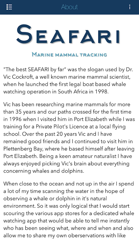 سیفاری به کاربران عضو شده اجازه می دهد تا فعالیت پستانداران دریایی را گزارش و پیگیری کنند. این برنامه همچنین شامل اطلاعات مربوط به گونه ها ، تصاویر و نقشه های توزیع برای پستانداران دریایی مخصوص سواحل آفریقای شرقی و جنوبی است.