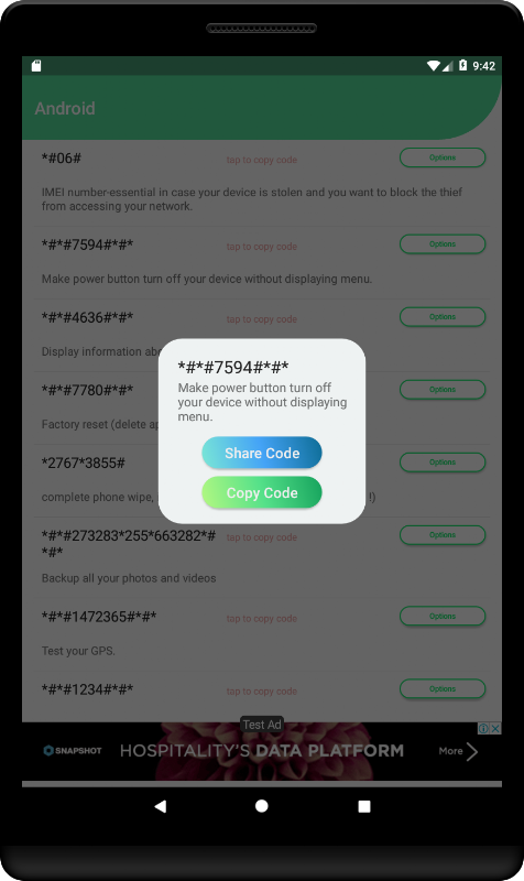 این برنامه یک لیست از کدهای مخفی برای ویژگی های مختلف از دستگاه خود را فراهم می کند.