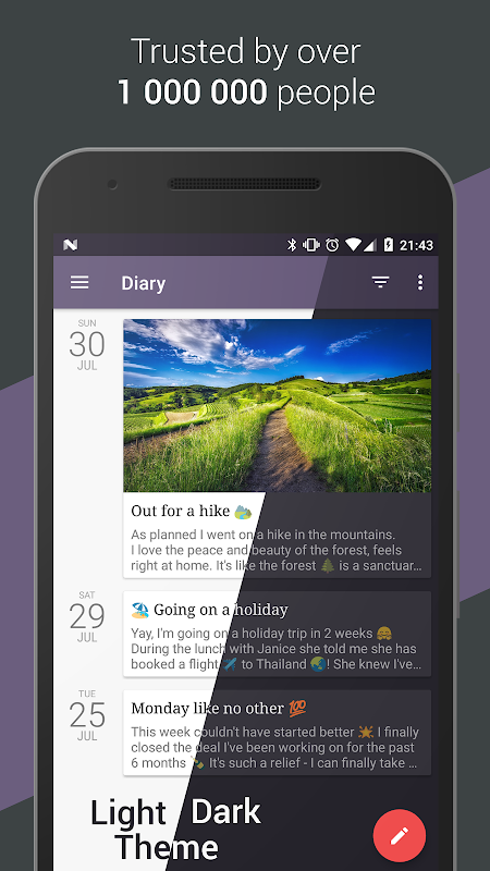 Secret Diary with lock password, ability to add images, tag entries, create backups, automatic day/night mode and customisation of the interface colours is the best personal diary with lock on the market.