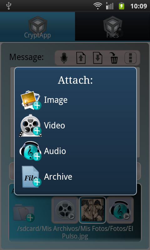 Con CryptApp encripta tus mensajes y archivos, para que puedas compartirlos de forma segura con (WhatsApp, Line, Google Drive, Dropbox, ...) y que solo aquellos que conocen la clave puedan recuperar tus mensajes y archivos secretos.