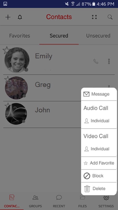 Secured messaging, calls, photos, videos, audio and file sharing.