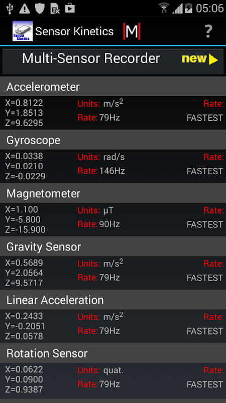 Sensor Kinetics® is an advanced viewer and monitor for all of the standard sensors available in your Android device. It allows you to demonstrate sensor activity and perform complex and detailed experiments. The built-in Multi-Sensor Recorder allows you to view and record multiple sensors simultaneously.