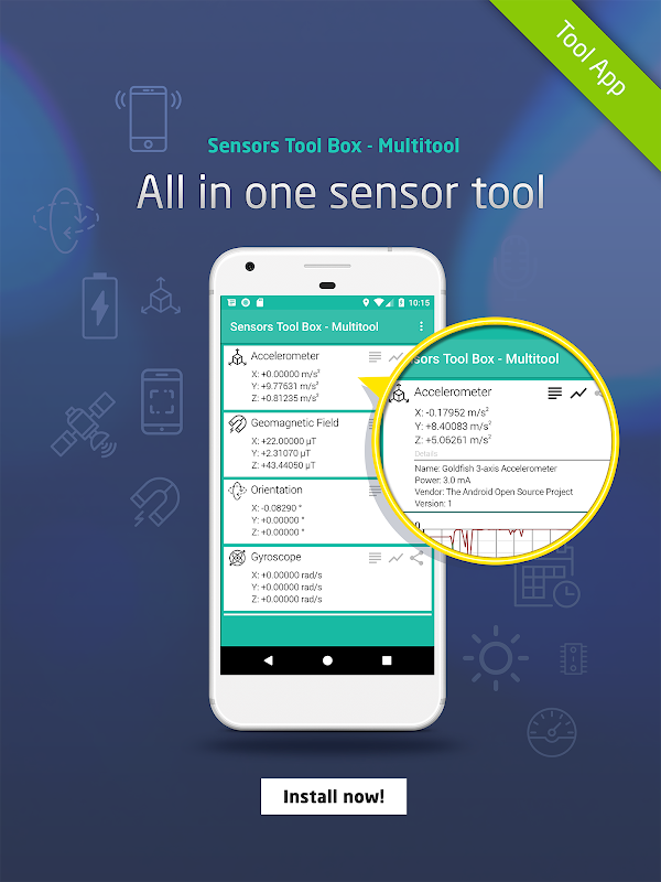 سنسور جعبه ابزار - ابزار چند بیشتر از همه از سنسور در گوشی های هوشمند خود را می سازد. با یک رابط کاربر پسند و آسان به خواندن طرح، سنسور جعبه ابزار اجازه می دهد تا شما را به جمع آوری داده ها را در زمان واقعی برای هر و همه سنسور بر روی تلفن خود را. تبدیل داده به آسان به خواندن نمودار با یک بازخوانی دقیق از هر سنسور.