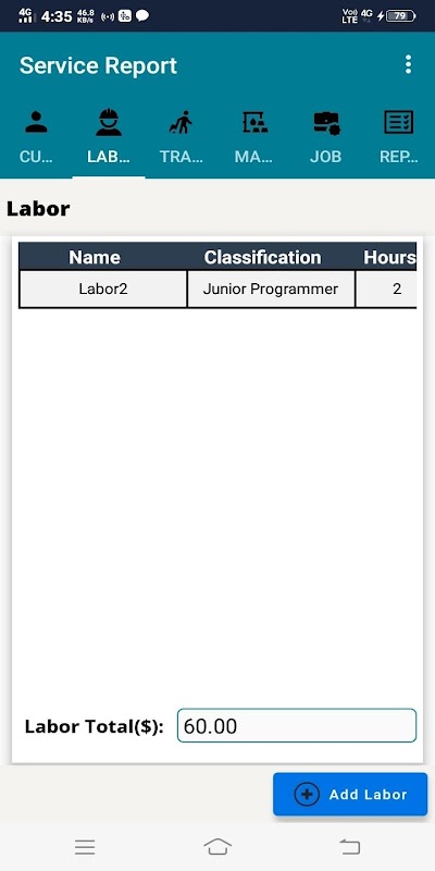 2. Labor: Allows the user to add ,update and delete the labor charges such as classification, hours, rates