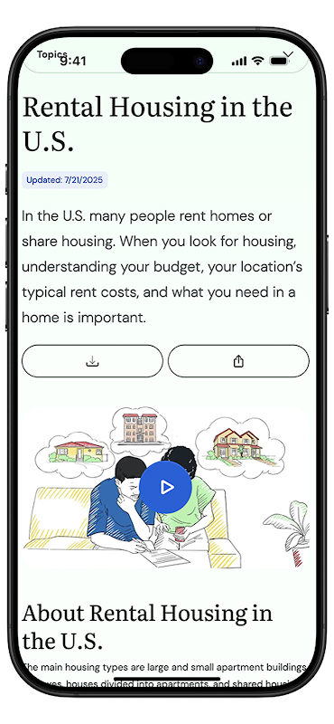 Settle In در هنگام اسکان مجدد خود به ایالات متحده یك یك كمك مفید برای پناهندگان است. با فیلم های کوتاه و درس های تعاملی ، می توانید در مورد طیف گسترده ای از مباحث جهت گیری فرهنگی قبل و بعد از ورود مطلع شوید. به اطلاعات ارزشمند در مورد کمک آژانس اسکان مجدد ، مقررات مسکن ، جستجوی شغل و موارد دیگر دسترسی پیدا کنید.