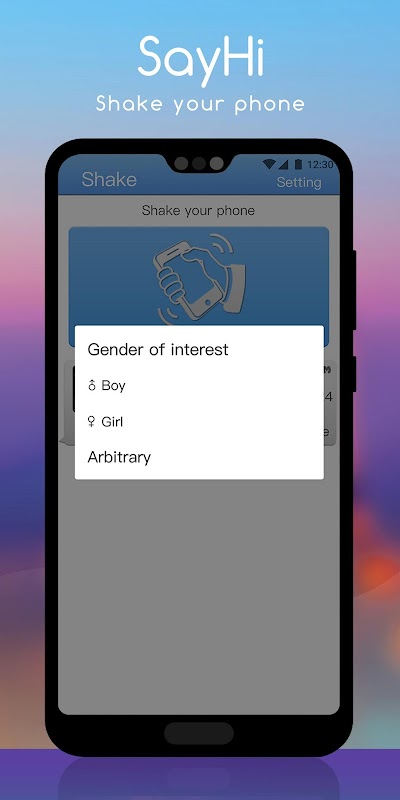 1. شما می توانید با انتخاب جنسیت مورد علاقه خود و تکان دادن تلفن همراه خود ، به راحتی از یک کاربر مطلع شوید.