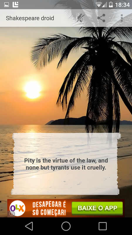 The Shakespeare Droid gives to you many quotes of the great William Shakespeare, allowing that you'll have a high quality lecture, listening a quiet song and with a great background image.