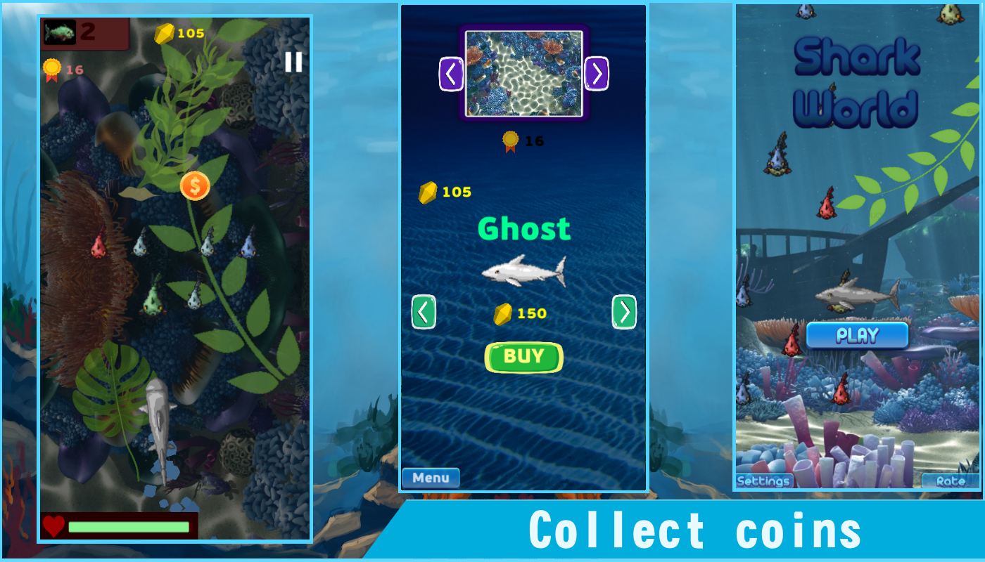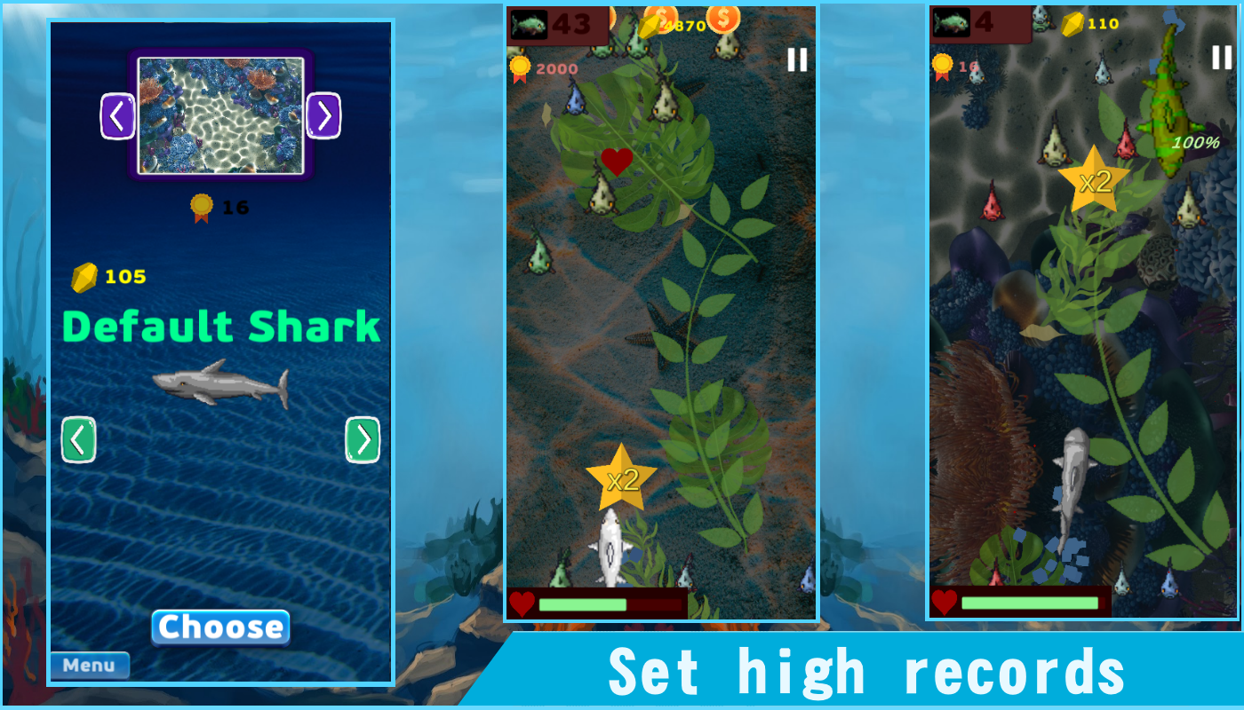 سعی کنید در مکان های مختلف کوسه باشید ، با کوسه های دیگر بجنگید و همه ماهی ها را بخورید. با حرکت انگشت خود کوسه خود را حرکت دهید و همه ماهی هایی را که در راه شما هستند بخورید. سکه و موارد دیگر مانند قلب و ستاره را جمع آوری کنید. از سکه های جمع آوری شده برای خرید کوسه های جدید استفاده کنید ، هزینه کوسه بیشتر است - قدرتمندتر است. با خوردن ماهی و شکست دادن کوسه های دیگر رکوردهای بالایی را ثبت کنید تا بتوانید نقشه های جدیدی را باز کنید. نقشه های مختلف و جالب زیادی وجود دارد که می توانید برای زنده ماندن تلاش کنید.