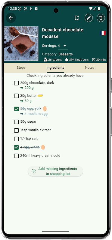 - مشاهده گام به گام دقیق: دستور العمل ها را با دستورالعمل های واضح و آسان برای خواندن دنبال کنید. تصاویر و تایمرهای اختیاری را به مراحل جداگانه اضافه کنید. مقادیر مواد به طور خودکار با وعده های مورد نظر تطبیق داده می شود.