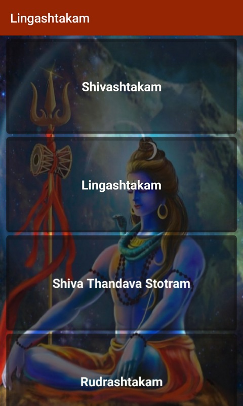Shiv Tandav Stotram (शिव तांडव स्तोत्रम) برنامه رایگانی است که به شما امکان می دهد Shiv Tandav Stotram را بخوانید و همچنین شعار دهید. این برنامه به زبان هندی و انگلیسی در دسترس است. شما می توانید آن را با توجه به راحتی خود بخوانید. شما می توانید به Shiv tandav stotram در حین گوش دادن به صدای آن گوش دهید. Media Player در دسترس است که به شما امکان می دهد هر چند بار که می خواهید Shiv Tandav Stotram را پخش کنید، مکث کنید.