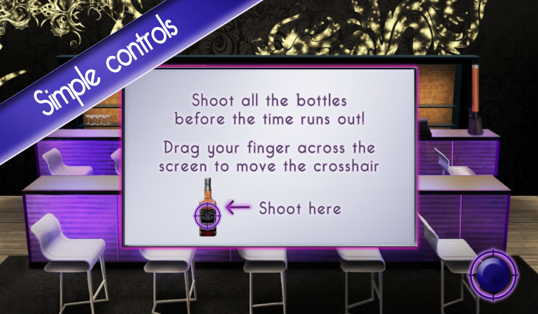 Drag your finger anywhere across the screen to move the crosshair. Aim to the bottles and shoot them!