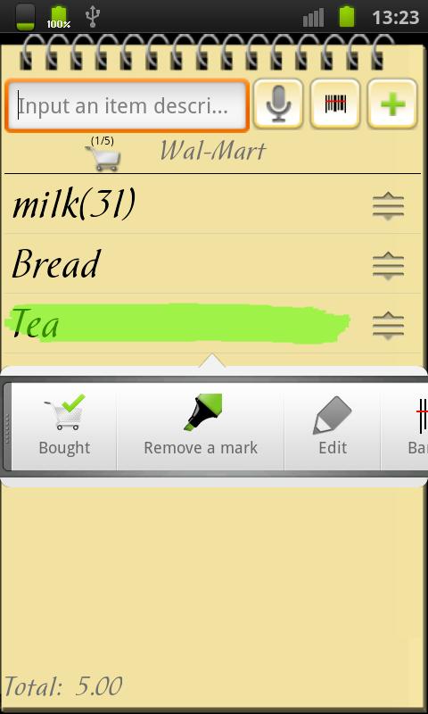 این راه مفید و ساده از ساخت یک لیست خرید در گوشی خود را است. شما می توانید آیتم های ورودی از صفحه کلید، از پایگاه داده، پر شده توسط شما اضافه کنید، با اسکن بارکد و حتی با استفاده از صدای خود را! همچنین شما می توانید علامت خریدهای مهم در این فهرست است. شما فقط باید به شیر مورد آن را به عنوان "خریداری" علامت.