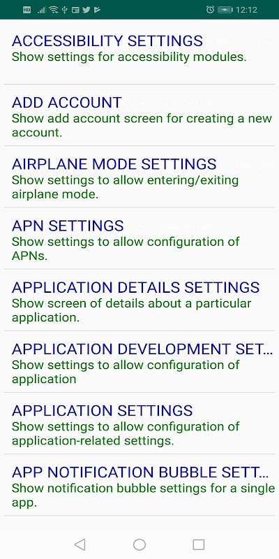 <"b> <font color = "blue> لیست میانبر <font> </b/><br><br>تنظیمات دسترسی<br>اضافه کردن حساب<br>تنظیمات حالت هواپیما<br>تنظیمات APN<br>تنظیمات جزئیات برنامه<br>تنظیمات برنامه کاربردی<br>تنظیمات برنامه<br>تنظیمات BUBBLE اعلان APP<br>تنظیمات اطلاع رسانی APP<br>تنظیمات جستجوی APP<br>APP استفاده از تنظیمات<br>تنظیمات باتری ذخیره می شود<br>تنظیمات بلوتوث<br>تنظیمات CAPTIONING<br>تنظیمات CAST<br>تنظیمات اطلاع رسانی CHANNEL<br>تنظیمات رومینگ DATA<br>تنظیمات استفاده از داده ها<br>تنظیمات تاریخ<br>تنظیمات اطلاعات دستگاه<br>تنظیمات نمایشگر<br>تنظیمات DREAM<br>انگلستان<br>تنظیمات سخت افزار KEYBOARD<br>تنظیمات صفحه اصلی<br>تنظیمات محدودیت داده های پیشین IGNORE<br>تنظیمات بهینه سازی باتری IGNORE<br>تنظیمات روش ورودی<br>INPUT SETTING SETTING METHOD METHOD<br>تنظیمات داخلی ذخیره سازی<br>تنظیمات LOCALE<br>تنظیمات SOURCE محل<br>مدیریت تمام برنامه های کاربردی<br>مدیریت برنامه های کاربردی<br>مدیریت تنظیمات APP DEFAULT<br>مدیریت مجوز کامل<br>مدیریت منابع نامفهوم APP<br>MANAGE WRITE SETTINGS را مدیریت کنید<br>تنظیمات کارت حافظه<br>تنظیمات شبکه OPERATOR<br>NFCSHARING تنظیمات<br>NFC تنظیمات پرداخت<br>NFC تنظیمات<br>تنظیمات شبانه<br>تنظیمات اطلاع رسانی اطلاع رسانی<br>تنظیمات شنوایی اعلامیه<br>تنظیمات اطلاع رسانی سیاست دسترسی<br>تنظیمات چاپ<br>تنظیمات حریم خصوصی<br>URI اتصال آسان به WIFI PROCESS<br>راه اندازی سریع راه اندازی<br>درخواست بهینه سازی باتری Ignore<br>REQUEST SET AUTOFILL SERVICE<br>تنظیمات جستجو<br>تنظیمات امنیتی<br>تنظیمات<br>INFO را نشان می دهد<br>تنظیمات صدا<br>تنظیمات ذخیره سازی حجم ذخیره<br>تنظیمات SYNC<br>تنظیمات دسترسی استفاده<br>تنظیمات DICTIONARY USER<br>MODE AIRPLANE CONTROL VOICE<br>کنترل باتری کنترل کننده باتری حالت را حفظ می کند<br>کنترل اختلال نباشید<br>تنظیمات ورودی VOICE<br>تنظیمات VPN<br>VR تنظیمات شنوایی<br>تنظیمات WEBVIEW<br>تنظیمات WIFI IP<br>تنظیمات WIFI