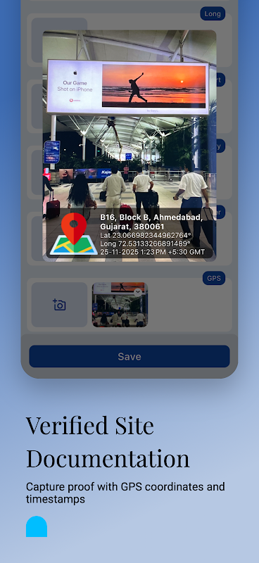 - گرفتن عکسهای سایت با مختصات GPS، آدرسها و مهرهای زمانی جاسازی شده. هر تصویر برای پاسخگویی کامل از نظر جغرافیایی تأیید شده است.