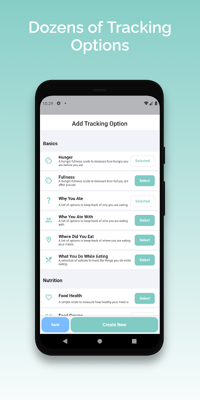 - بیش از 40 گزینه ردیابی از پیش تعریف شده در دسترس مانند گرسنگی/سیری، تایمر غذا، چرایی غذا خوردن، نحوه غذا خوردن بعد از غذا خوردن، ردیاب خلق و خو، با چه کسی غذا خوردید و موارد دیگر.