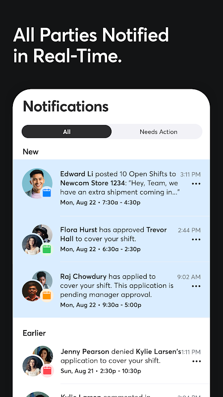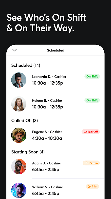 شیفت به کارمندان این قدرت را می دهد که شیفت خود را عوض کنند ، اعضای تیم پیام را ببندند و برنامه ها را مدیریت کنند ، همه اینها از طریق دستگاه تلفن همراهشان است. کاربران هر روز به Shyft اعتماد می کنند تا به آنها کمک کند تا در زمان واقعی برنامه کاری خود را تنظیم کنند و با تیم خود در ارتباط باشند.