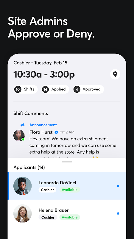 به دنبال کسب درآمد اضافی هستید؟ با مرور فرصت های کاری موجود در Shift Marketplace ، شیفت ها را انتخاب کنید. برای اعمال ضربه بزنید. پس از تأیید ، وارد کار شوید!