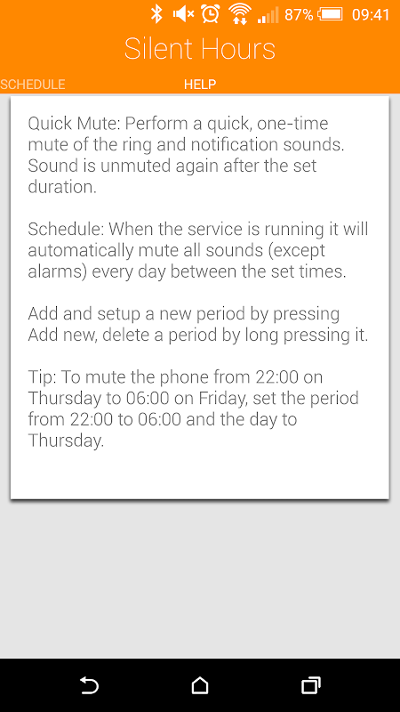 - Now works on Android 5.0 Lollipop! (NOTE: The volume will be locked when the app silences the device, you will have to change the notification mode to "All" to abort the silent period prematurely)