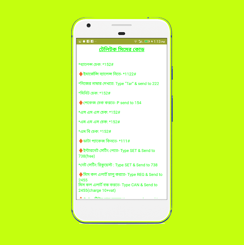 বাংলাদেশের সকল সিমের দরকারি কোড সমূহ এই এপ্সে আপনি পেয়ে যাবেন । আমরা যখন আমাদের মোবাইলে কোন না কোন সিম ব্যবহার করে থাকি তখন আমাদেরকে ইন্টারনেট প্যাকেজ, বোনাস প্যাকেজ, মিনিট প্যাকেজ এবং দরকারি অনেক কোডের প্রয়োজন হয়।