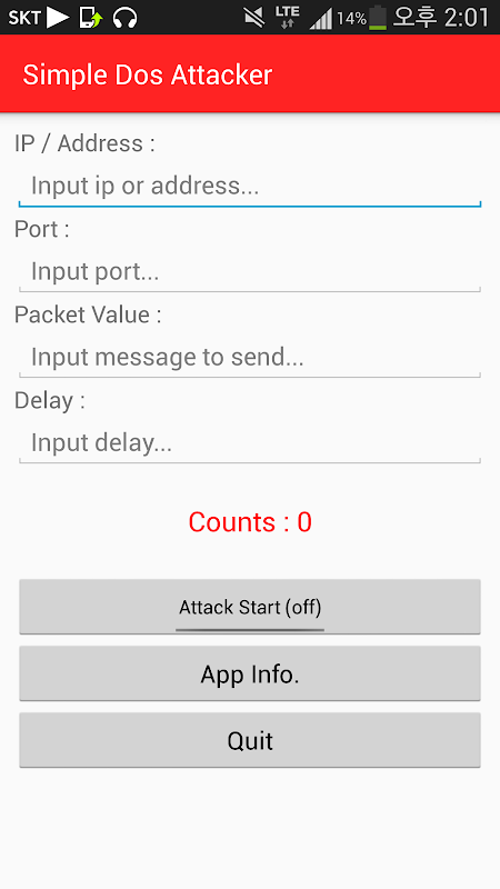 Input IP address or domain, port, packet's value and delay. Then, if you touch "Attack Start" Button, Dos Attack will be started.