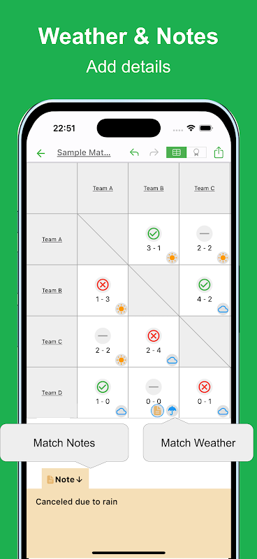نتایج را وارد کنید و بلافاصله وضعیت هر دور را در یک شبکه مرتب مشاهده کنید。