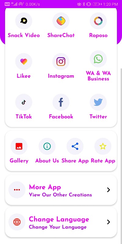 همه در یک حالت Saver برای کسانی که می خواهند تصویر و فیلم مورد علاقه خود را از WhatsApp ، Tiktok ، Likee ، Instagram ، Facebook و Twitter ذخیره کنند ، آسان و مفید است.