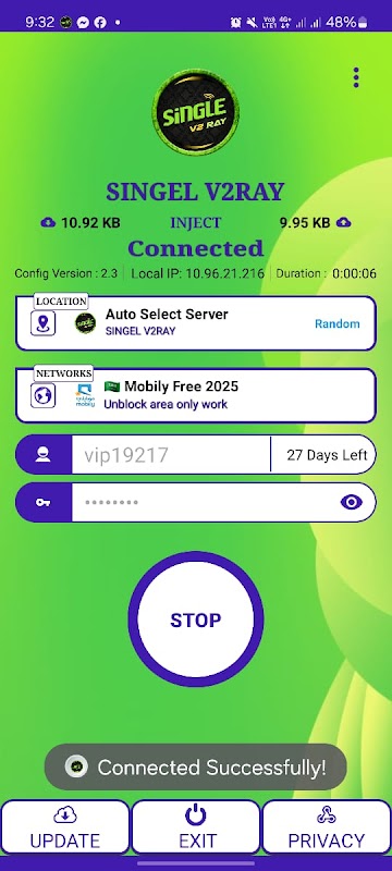 اپلیکیشن Single V2RAY یک تجربه VPN سریع، قابل اعتماد و نامحدود را ارائه میکند – برای هر کسی که به حریم خصوصی آنلاین اهمیت میدهد، میخواهد دسترسی نامحدود به محتوای جهانی داشته باشد یا به سادگی به یک اتصال اینترنتی امن نیاز دارد، ایدهآل است. خواه در حال مرور، پخش جریانی یا بازی هستید، Single V2RAY داده های شما را ایمن نگه می دارد و اتصال شما را قوی نگه می دارد.