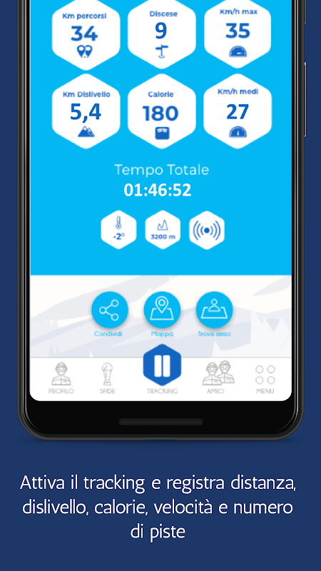 Ski Win takes into account the speed, the difference in height and the vertical movement, optimizing the tracking of performance even in ascent and descent. The descent time is interrupted during the ascent of the ski lifts to ensure maximum tracking accuracy.