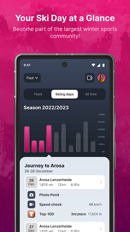 با Skiline می توانید به راحتی آنچه را که در دامنه ها انجام داده اید ببینید و به اشتراک بگذارید. به سادگی کارت اسکی خود را با گوشی هوشمند خود اسکن کنید تا متوجه شوید چقدر اسکی کرده اید، ارتفاعی که طی کرده اید و چه آسانسورهایی را سوار کرده اید. تجربیات اسکی خود را برای همیشه ارزشمند کنید.