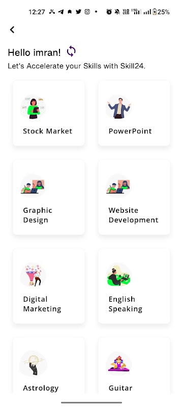 به Skill24 خوش آمدید - برنامه یادگیری الکترونیکی توسعه مهارت توسط Class24، هدف اصلی ما این است که آموزش را در همه زمینه ها به ساده ترین روش در دسترس قرار دهیم. این می تواند راهی عالی برای بهبود مهارت های تحصیلی شما با کسب درآمد باشد. از طریق این اپلیکیشن می توانید یک دوره آنلاین حرفه ای را از خانه انجام دهید. مانند بازاریابی دیجیتال، طراحی گرافیک، طراحی وب، MS Office، ویرایش ویدئو، حساب دیجیتال، Tally Prime، وبلاگ نویسی، فتوشاپ، رقص، ورزش و غیره همه چیز به هر زبانی.
