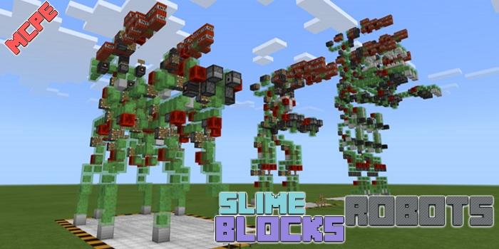 This map features several robots which utilize blocks of redstone and slime blocks with piston mechanics to enable functionalities required for walking robots.