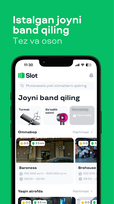SLOT – bu sartaroshxonalar، go‘zallik salonlari و boshqa xizmat ko‘rsatish joylariga qulay و tezkor bron qilish ilovasi. اندی سیز نوبت کوتماسدان، ایستالغان جوی و وقتدا اوذینگیزگا موس خیزمتنی تنلاشینگیز ممکین!