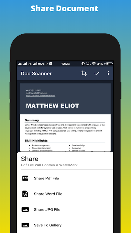 Open Smart Doc Scanner , the best document scanner app in the store, hold it straight against the document you would like to scan. The scanner app will automatically detect the document's edges. You can then crop, edit, rotate and apply filters and export the document as either JPG or PDF with a single tap.
