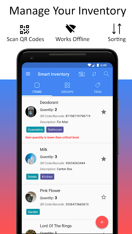 ما از پرکاربردترین 16 نوع جهانی کدهای QR و انواع بارکد جهانی برای اسکن پشتیبانی می کنیم. کدهای اسکن امکان مدیریت آسان اشیاء شما را فراهم می کند. پس از اسکن اشیاء خود می توانید به جزئیات آن شی بروید. با استفاده از حالت اسکنر ، می توانید مقادیر مورد خود را مستقیماً با اسکن کدهای آنها تغییر دهید. اگر بارکدی یا QR Code برای اشیاء خود ندارید ، برنامه ما آن را برای شما ایجاد می کند.